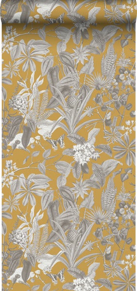 Sanders & Sanders Tapete tropische Blätter und Blüten Ockergelb und Grau 53 cm x 10 m