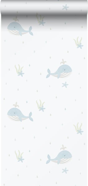 Diese niedliche Tapete mit Walen in Hellblau und Weiß hat eine schöne matte Oberfläche und verwandelt jedes Kinderzimmer in ein fröhliches Abenteuerland. Kombiniert mit hellen Farben und natürlichen Materialien, entsteht eine angenehme Atmosphäre, die zum Spielen, Lachen, Lesen und Träumen einlädt.