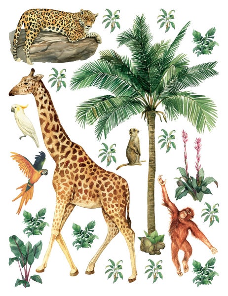 Dieses tolle Wandtattoo mit Dschungeltieren in Dschungelgrün verwandelt das Kinderzimmer in ein fröhliches Abenteuerland. Kombiniert mit hellen Farben und natürlichen Materialien, entsteht eine angenehme und freundliche Atmosphäre, die zum Spielen, Toben und Lachen einlädt.