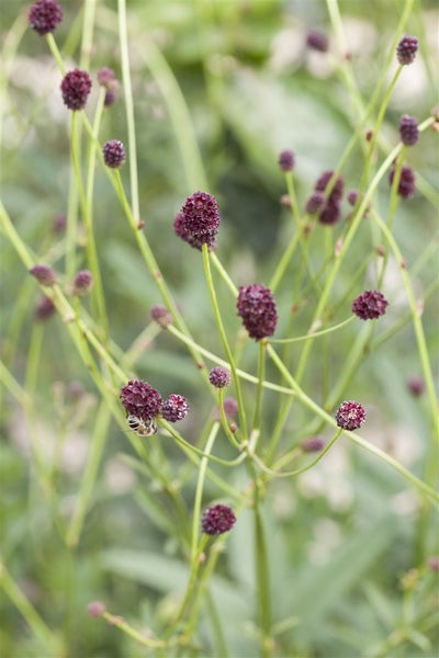 Sanguisorba officinalis, der Große Wiesenknopf, ist eine elegante, robuste Staude, die mit ihren tief dunkelroten bis purpurfarbenen Blütenköpfchen jeden Garten stilvoll bereichert. Die schlanken, aufrecht schwingenden Blütenstände erscheinen je nach Witterung von Juni bis September und setzen vertikale Akzente über filigran gefiedertem, blaugrünem Laub. Als langlebige Blütenstaude wächst der Große Wiesenknopf horstig und erreicht je nach Standort etwa 80 bis 120 cm Höhe, wodurch er im Staudenbeet, in der Rabatte oder als lockerer Solitär eine besondere, natürliche Leichtigkeit vermittelt. In Gruppenpflanzungen bringt er Rhythmus und Struktur, harmoniert hervorragend mit Ziergräsern und sommerblühenden Partnern und eignet sich in größeren Kübeln auch für Terrasse und Vorgarten, sofern eine gleichmäßige Wasserversorgung gewährleistet ist.