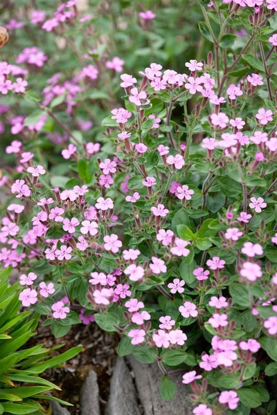 Saponaria ocymoides, das Polster-Seifenkraut, ist eine kompakte, teppichbildende Staude, die mit unzähligen rosigen bis karminrosa Blüten von Mai bis Juli leuchtende Farbakzente setzt. Die zierlichen, lanzettlichen Blätter bleiben frischgrün und bilden dichte, immer- bis wintergrüne Polster, die sich elegant über Steine und Mauerkronen schmiegen. Mit einer niedrigen Wuchshöhe von etwa 10 bis 15 Zentimetern und breitem, locker überhängendem Wuchs eignet sich diese Polsterstaude ideal als Bodendecker, für den Steingarten, Trockenmauern, Wegränder und den sonnigen Vordergrund im Beet. Auch in Schalen, Töpfen und Balkonkästen überzeugt sie als pflegeleichte Kübelpflanze, wo sie über den Rand kaskadenartig herabhängt und als kleine Solitärpflanze oder in Gruppenpflanzung gleichermaßen Wirkung zeigt. Saponaria ocymoides bevorzugt einen vollsonnigen bis licht halbschattigen Standort mit sehr gut durchlässigem, eher magerem, sandig-kiesigem Substrat; kalkhaltige Böden werden gut vertragen. Staunässe gilt es zu vermeiden, da die Wurzeln trocken-warme Bedingungen schätzen. Eine leichte Rückschnittpflege direkt nach der Blüte hält den Gartenstrauch kompakt, fördert die Nachblüte und erhält die geschlossene Polsterstruktur. Düngergaben sind nur sparsam nötig, was die Pflege im Vorgarten, am Beetrand oder auf Terrasse und Dachgarten besonders unkompliziert macht. Ob als flächige Steingartenpflanze, als dekorative Einfassung oder als lebendige Teppichbildung zwischen Trittsteinen – das Polster-Seifenkraut verbindet robuste Gartenpraxis mit natürlicher Zierwirkung und sorgt für dauerhaft harmonische Strukturen im Garten.