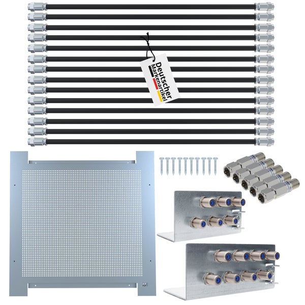 - Im Lieferumfang enthalten1x 40x40cm Montageplatte, 14x F-Verbindungskabel, 2x Erdungswinkel, 5x Sat Überspannungsschutzfilter
