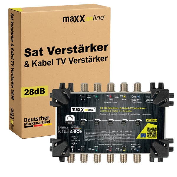 Der „All in One“ Antennenverstärker VST 9343 S für den Sat- & Kabel TV / DVB-T2 Empfang kompensiert elektrische Verluste bei langen Leitungswegen oder niedrigem Signalpegel. Mit 28 dB Verstärkung und der kaskadierbaren Ausführung kann der Verstärker am Anfang der Kaskade, oder als Zwischenverstärker eingesetzt werden. Ob für Einfamilienhäuser, Mehrfamilienhäuser, Krankenhäuser, Hotels etc. der Signalverstärker ist flexibel in seinen Einsatzmöglichkeiten.Dank neuester Technologie bietet der Sat Leitungsverstärker eine maximale Sendervielfalt und eine hervorragende Bild- und Tonqualität in HD, Full-HD, HDTV, 4K, 8K und UHD. Die Installation und Inbetriebnahme ist dank deutscher und englischer Bedienungsanleitung mit Tipps kinderleicht.Technisch überzeugt der Sat Verstärker mit einem hohen Ausgangspegel von bis zu 115 dBµV und einem breiten Frequenzbereich für Sat-Signale (950 - 2150 MHz) sowie Kabel-TV und terrestrische Signale (87 - 862 MHz + Rückkanal 5 - 65 MHz). Die Ein- und Ausgänge sind F-Buchsen ausgeführt, die mit handelsüblichen RG6 F-Steckern belegt werden.Die Leistungsaufnahme des Antennenverstärkers ist mit nur 4W sehr gering.