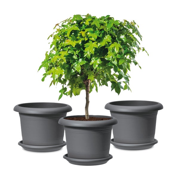 Scheurich 3er Set Blumentöpfe Oliver mit Untersetzern, Farbe: Metallic Grey, 40,4 cm Durchmesser, 28,1 cm hoch, 19,3 l Vol.
