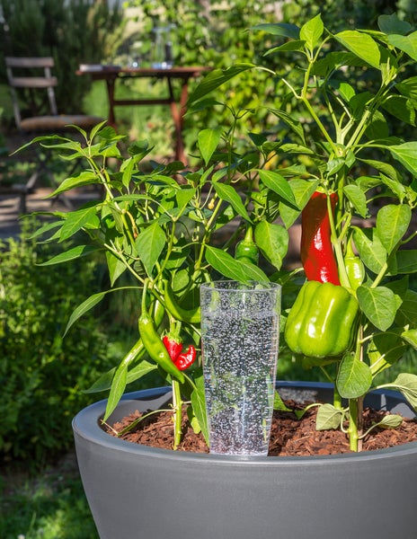 Copa ist der elegante Bewässerungshelfer aus UV-beständigem, durchscheinenden Kunststoff mit feinem Perlenmuster. Als Wasser-Reservoir versorgt er Pflanzen im Garten, auf Terrasse und Balkon sowie im Wohnbereich mit Wasser - vor allem, wenn Sie ein paar Tage nicht zu Hause sind. Bei Frost sollte Copa lieber nach drinnen umziehen.
