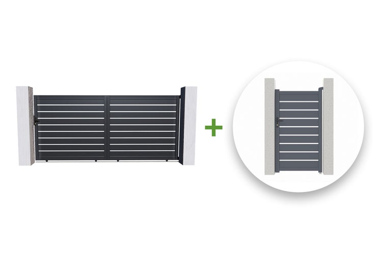Schiebetor 3,5m VOGEL H.180cm + Gartentür 1m VOGEL H.180cm aluminium grau