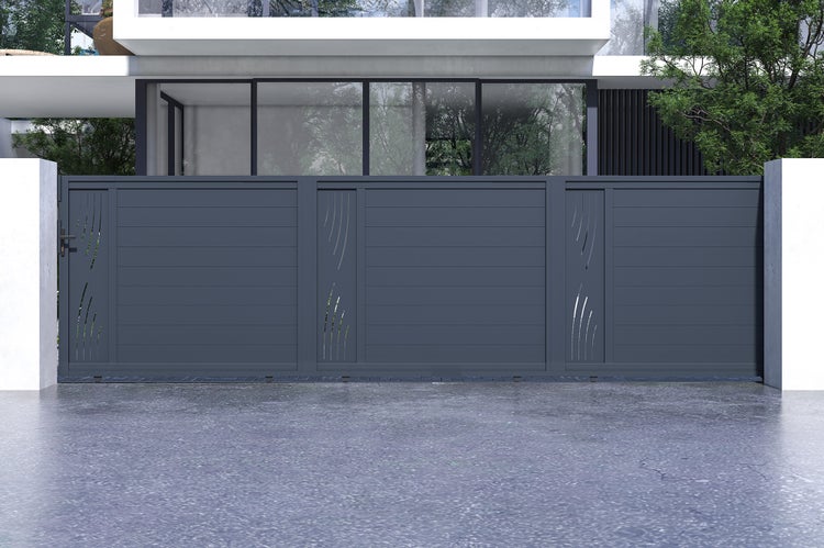 Entdecken Sie die unvergleichliche Eleganz unseres Aluminium-Schiebetors XL VELETA, das mit dekorativen Platten mit „Nature“-Motiven verziert ist