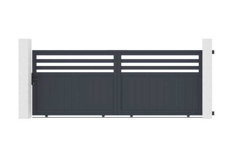 Entdecken Sie unser halbdurchbrochenes Schiebetor NEVIS, den perfekten Kompromiss zwischen einem durchbrochenen und einem vollen Tor, um Ihren Bedürfnissen nach Privatsphäre gerecht zu werden und gleichzeitig Ihre Sichtbarkeit zu behalten.
