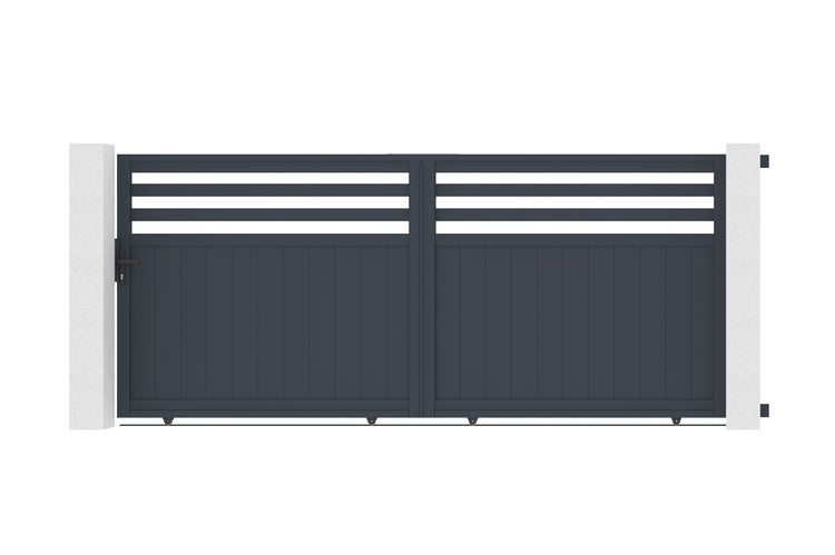Entdecken Sie unser halbdurchbrochenes Schiebetor NEVIS, den perfekten Kompromiss zwischen einem durchbrochenen und einem vollen Tor, um Ihren Bedürfnissen nach Privatsphäre gerecht zu werden und gleichzeitig Ihre Sichtbarkeit zu behalten.