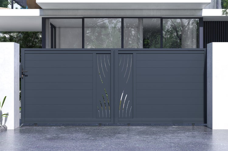 Entdecken Sie die unvergleichliche Eleganz unseres Aluminium-Schiebetors VELETA mit seinen dekorativen Platten mit Natur-Motiven.