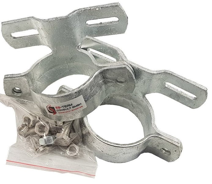 1 Paar Schilderklemme Rohrschelle Stahl Lochabstand 70mm für Pfosten mit Ø60 oder Ø76mm. Befestigung für flache Schilder / Verkehrsschilder inkl. VA Schrauben
