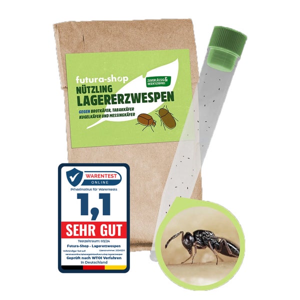 - WirkungsweiseNatürliche, giftfreie Bekämpfung der Käfer durch Lagererzwespen
