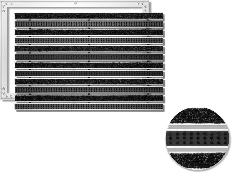 Rostfreier Aluminium Rahmen: Die Eingangsmatte für Innen und Außen wird mit einem langlebigem Alu Einbaurahmen geliefert, perfekt integrierbar in jede Bodenvertiefung sowie in Fliesen.