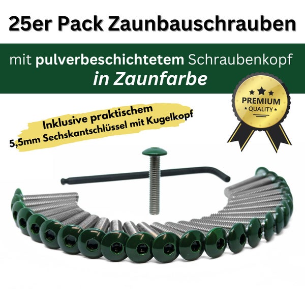 - Im Lieferumfang enthalten25x Zaunbauschraube in Farbe + Kugelkopf Sechskantschlüssel