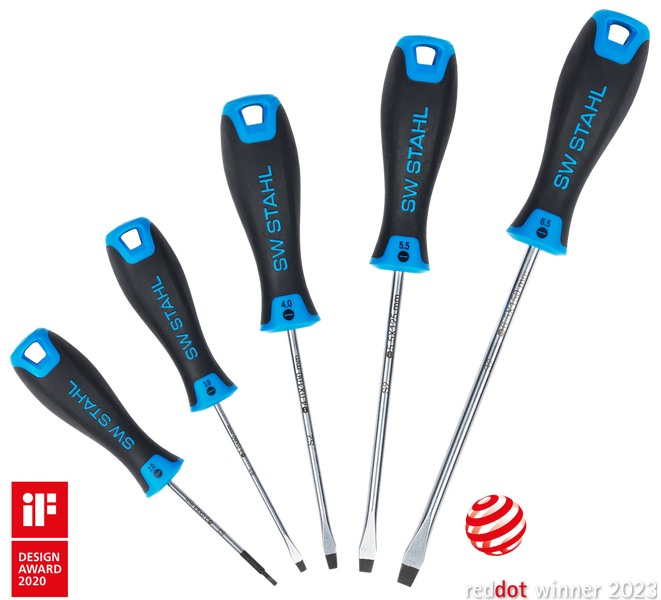 Der SW STAHL Schraubendrehersatz, enthält 5x Schlitz: 2,0 mm, 3,0 mm, 4,0 mm, 5,5 mm, 6,5 mm. Optimale Drehmomentübertragung durch ergonomische und rutschfeste Griffform, mit Loch im 2-Komponenten-Handgriff zur Drehmomentverstärkung. Die Schraubendreher sind besonders langlebig durch verdrehsichere Verbindung von Klinge und Griff.