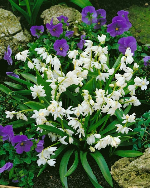 Scilla siberica ‘Alba’ bevorzugt einen sonnigen bis halbschattigen Standort mit lockerem, humosem und gut durchlässigem Boden, der frisch bis mäßig trocken sein darf. Staunässe sollte vermieden werden, damit die Zwiebeln gesund bleiben. Die Pflege ist unkompliziert: Nach der Blüte das Laub vollständig einziehen lassen, damit die Pflanze Kraft für die nächste Saison sammelt; Teilung und Umsetzen erfolgen am besten nach dem Vergilben der Blätter. Robust und winterhart, kehrt dieser klassische Frühlingsblüher zuverlässig jedes Jahr zurück und harmoniert reizvoll mit Krokussen, Traubenhyazinthen, Narzissen und Helleborus. Als niedrige Zwiebelstaude bereichert der Sibirische Blaustern ‘Alba’ sowohl natürliche Gartensituationen als auch ordentliche Beetgestaltungen und setzt strahlend weiße Akzente von der Einzelpflanzung bis zur großzügigen Gruppenpflanzung.