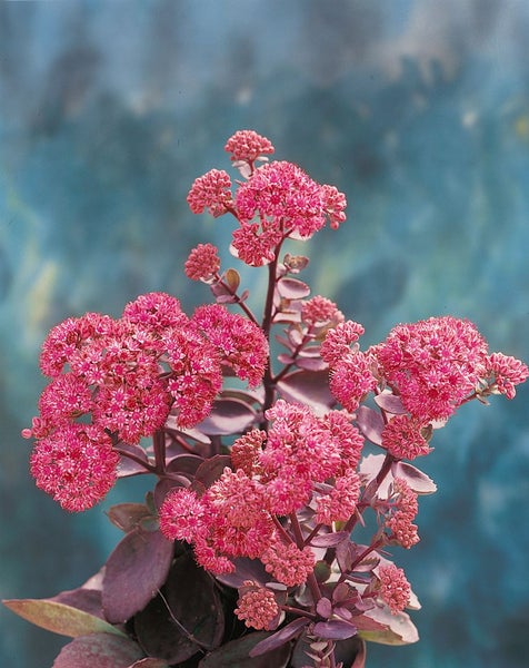 Sedum cauticola ‘Vera Jameson’, die dekorative Herbst-Fetthenne, überzeugt als kompakte Staude mit eleganter Farbwirkung und zuverlässigem Wuchs. Die sukkulenten, rundlich-ovalen Blätter schimmern in Tönen von purpurgrün bis bronzerot und verdichten sich im Sommer zu einem dichten, niedrigen Polster. Ab Spätsommer bis in den Herbst erscheinen flache, doldenartige Blütenstände mit zahlreichen sternförmigen Einzelblüten in rosarosa bis purpurrosa, die über den weinrot gefärbten Stielen besonders intensiv wirken. Der Wuchs bleibt standfest, horstig bis teppichbildend und erreicht in der Regel 20 bis 30 cm Höhe, wodurch die Pflanze ideal für den vorderen Beetbereich geeignet ist.