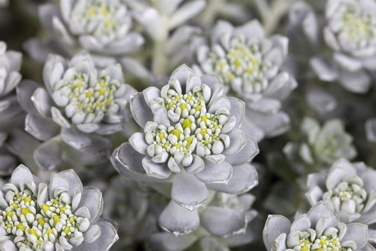 Sedum spathulifolium ‘Cape Blanco’, die Löffel-Fetthenne, ist eine kompakte Polsterstaude aus der Familie der Dickblattgewächse, die mit ihren silbrig bereiften, löffelförmigen Blättern und dichten Rosetten sofort ins Auge fällt. Die immergrüne bis wintergrüne Gartenstaude bildet flache, teppichartige Polster und setzt mit ihrem blaugrünen bis weiß überhauchten Laub ganzjährig elegante Akzente. Im späten Frühling bis Frühsommer erscheinen zahlreiche sternförmige, leuchtend gelbe Blüten, die einen attraktiven Kontrast zum kühlen Laubton bilden. Der Wuchs bleibt niedrig und breitet sich mattenbildend aus, wodurch sich diese Zierpflanze hervorragend als Bodendecker, Einfassung oder für den Vordergrund im Beet eignet.