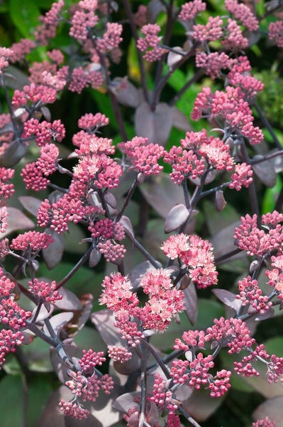 Sedum telephium ‘Xenox’ – auch als Hohe Fetthenne oder Purpur-Fetthenne bekannt – ist eine ausdrucksstarke Gartenstaude mit modernem Charakter. Die robuste Zierstaude zeigt auffallend dunkel purpur bis schwarzrot gefärbtes, dickfleischiges Laub, das den ganzen Sommer über für starke Kontraste im Beet sorgt. Ab Spätsommer öffnen sich flache, doldenförmige Blütenstände in kräftigem Rosarot bis Weinrot, die bis in den Herbst hinein attraktiv bleiben und auch im Winter als strukturgebende Samenstände zieren. Der Wuchs ist kompakt, buschig und standfest, meist 40 bis 50 cm hoch, damit ideal für sonnige Rabatten, den Steingarten, Präriebeete und den Kiesgarten.