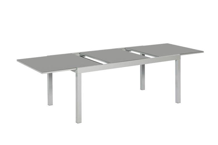 Der Tisch besticht durch sein elegantes silbernes Gestell und die geschmackvolle grauen Glasplatte, die jedem Außenbereich einen Hauch von Eleganz verleihen. Die Tischplatte ohne Rand sorgt zudem für eine moderne Optik.