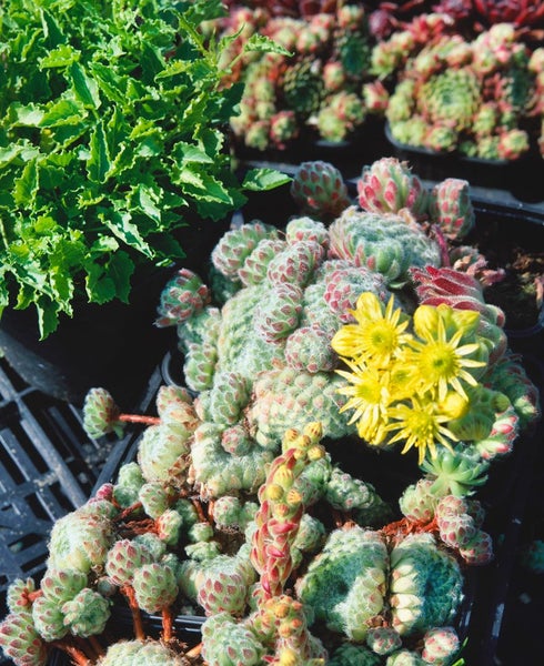 Sempervivum ciliosum ‘Borisii’, die Wimpern-Hauswurz oder Dachwurz, ist eine robuste Zierstaude aus der Familie der Sukkulenten, die mit kompakten, dichten Rosetten in frischem Gelbgrün und fein bewimperten Blatträndern beeindruckt. Die fleischigen, strahlenförmig angeordneten Blätter zeigen je nach Jahreszeit rötliche Spitzen und bilden im Laufe der Zeit ein attraktives, teppichartiges Polster. Im Sommer erscheinen auf kräftigen Stielen sternförmige, gelblichgrüne Blüten, die den charakteristischen Blütenaspekt dieser Polsterstaude betonen. Als pflegeleichter Gartenstaub und Zierpflanze überzeugt ‘Borisii’ im Steingarten, Alpinum, in Fugen und auf Trockenmauern ebenso wie in flachen Schalen, Töpfen und Trögen als dekorative Kübelpflanze auf Balkon und Terrasse. Im Vorgarten setzt sie als niedriger Solitär in Schalen reizvolle Akzente, eignet sich aber auch für flächige Gruppenpflanzungen und als bodendeckender Teppich zwischen Gräsern und anderen trockenheitsverträglichen Stauden. Bevorzugt wird ein vollsonniger Standort mit durchlässigem, eher magerem, mineralischem Substrat; Staunässe sollte unbedingt vermieden werden, da die Rosetten am liebsten schnell abtrocknen. Die frostharte Gartenstaude ist äußerst genügsam, benötigt nur minimale Wassergaben und kommt ohne regelmäßige Düngung aus. Nach der Blüte stirbt die jeweilige Rosette natürlich ab, während zahlreiche Kindel für stetigen Nachschub sorgen und den Bestand verjüngen. So bleibt Sempervivum ciliosum ‘Borisii’ dauerhaft vital, formt langlebige, immergrüne Polster und setzt ganzjährig strukturstarke Akzente in modernen Kiesbeeten, auf Dachflächen und in naturnahen Gestaltungskonzepten mit sukkulenten Blattschmuckpflanzen.
