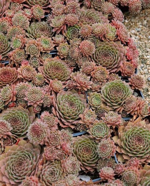 Sempervivum marmoreum ‘Rubin’, auf Deutsch auch Dachwurz oder Hauswurz, ist eine robuste, immergrüne Sukkulente, die mit dichten, symmetrischen Rosetten in warmen Rubin- bis Bordeauxnuancen begeistert. Die kompakt bleibende Polsterstaude bildet zahlreiche Ausläufer und entwickelt so im Laufe der Zeit attraktive Teppiche, die Steingarten, Trockenmauer oder Kiesbeet strukturiert und pflegeleicht füllen. Die Blattfarbe variiert jahreszeitlich: Im Frühjahr und Herbst leuchten die Rosetten besonders intensiv rot, während sie im Sommer je nach Sonneneinstrahlung bronzefarbene bis grünliche Töne annehmen. Im Frühsommer erscheinen über den Rosetten aufrechten Blütenständen sternförmige, rosa bis purpurfarbene Blüten, die den architektonischen Charakter dieser Steingartenpflanze wirkungsvoll unterstreichen.