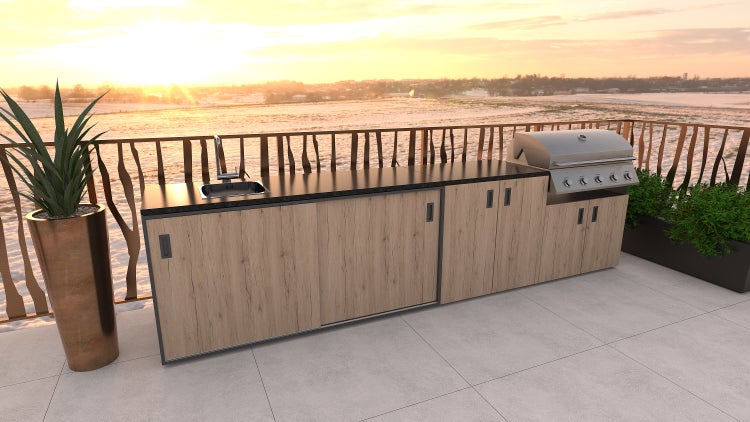 Set Bologna - Eiche - Granit - Pulverbeschichtete Edelstahl-Outdoorküche mit Spüle, eingebautem Gasgrill und Arbeitsplatte aus Granit