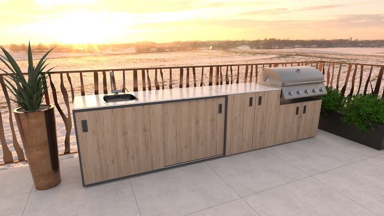 Set Bologna - Eiche - Porzellan - Pulverbeschichtete Edelstahl-Outdoorküche mit Spüle, eingebautem Gasgrill und Arbeitsplatte aus Porzellan