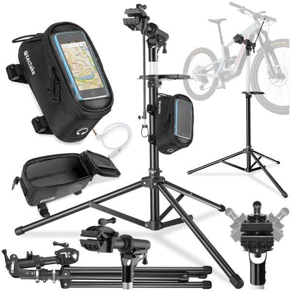 Rundum-sorglos-PaketMit diesem Set aus einem stabilen, standsicheren Montageständer und einer wasserabweisenden Rahmentasche von tectake erhältst Du ein durchdachtes Komplettpaket, das Dir sowohl bei der Radreparatur als auch auf der Radtour praktische Vorteile bietet.Wartung leichtgemachtDank der stufenlos höhenverstellbaren Teleskopstange kannst Du Dein Fahrrad mühelos auf die passende Arbeitshöhe bringen. Die 360° drehbare, gummierte Halterungsklemme ist äußerst lackschonend und für alle gängigen Rahmengrößen geeignet, auch für E-Bikes. Der Vorderrad-Stabilisator fixiert das Rad noch zusätzlich und garantiert so ein absolut sicheres Arbeiten. Sämtliche Einstellungen werden mithilfe von Schnellverschlüssen vorgenommen, wodurch der Reparaturständer extrem leichtgängig in der Handhabung ist.Die integrierte Werkzeugablage mit Magnetfunktion sorgt zudem dafür, dass Du Schrauben, Zubehör oder Werkzeug stets griffbereit hast – für eine komfortable wie effiziente Wartung in der heimischen Werkstatt.Bestens ausgerüstetDie im Set enthaltene wasserabweisende Rahmentasche besitzt an der Unterseite eine Anti-Rutsch-Beschichtung und wird mit einer zuverlässigen Klettverschlusshalterung sicher am Fahrrad befestigt. Besonders praktisch ist das gefütterte Handyfach mit großem Touch-Sichtfenster, das Dir die Bedienung Deines Smartphones auch während der Fahrt ermöglicht.Weitere nützliche Features sind der geschützte Kopfhörerausgang, das Audio-Verlängerungskabel und das Spannseil zur sicheren Fixierung. Damit wird die Tasche zu einem vielseitigen Begleiter - egal ob auf dem täglichen Weg zur Arbeit oder bei einer 2-wöchigen Radtour.Absolutes Must-haveMit diesem Fahrradset von tectake bekommst Du ein cleveres Duo: Der individuell einstellbare Montageständer erleichtert sämtliche Arbeiten am Rad enorm, während die große Rahmentasche Platz für Deine wichtigsten Wertsachen bietet. So kannst Du Dich nach der Reparatur direkt aufs Rad schwingen.