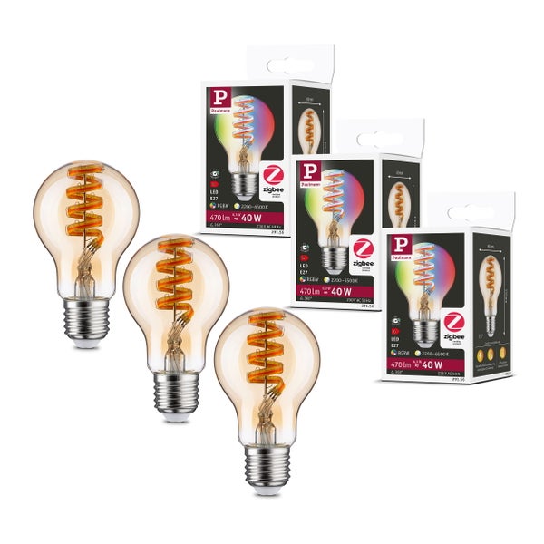 Die goldenen Zigbee 3.0 Filament-Leuchtmittel mit 470lm sind als Set im praktischen 5er Set zu einem vergünstigten Preis erhältlich. Sie überzeugen mit einem Vintage-Design und einem angenehmen, gleichmäßigen Licht. Dank RGBW bieten sie unzählige Möglichkeiten: Gemütlich gedimmtes Warmweiß, sachlich helles Tageslichtweiß oder Millionen von Farben. Die Lampen lassen sich per App oder Sprachbefehl über ein Smart Home Gateway, das über eine Zigbee Schnittstelle verfügt, einzeln oder innerhalb einer Gruppe steuern. Eine Steuerung ohne Gateway ist über eine Fernbedienung möglich. So kann jederzeit die passende Lichtstimmung gewählt werden. Dabei passt das Leuchtmittel in jede handelsübliche E27 Fassung. Die Paulmann LED-Lampen mit Eye friendly-Siegel bieten augenschonendes und komfortables Licht. Ob beim Arbeiten, Lesen oder Entspannen, die Lampen tragen zu besten Sehkomfort bei.