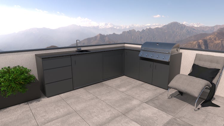 Set Florence - Anthrazit - Granit - Pulverbeschichtete L-förmige Edelstahl-Outdoorküche mit Spüle, eingebautem Gasgrill und Arbeitsplatte aus Granit