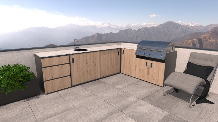 Set Florence - Eiche - Porzellan - Pulverbeschichtete L-förmige Edelstahl-Outdoorküche mit Spüle, eingebautem Gasgrill und Arbeitsplatte aus Porzellan