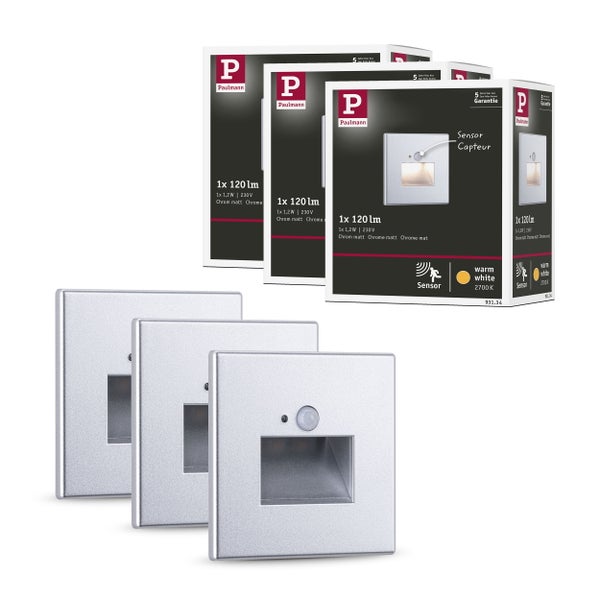 Set LED Wandeinbauleuchte Edge 3er-Set 80x80 mm 3x1,2W 3x25lm 230V 2700K Chrom matt