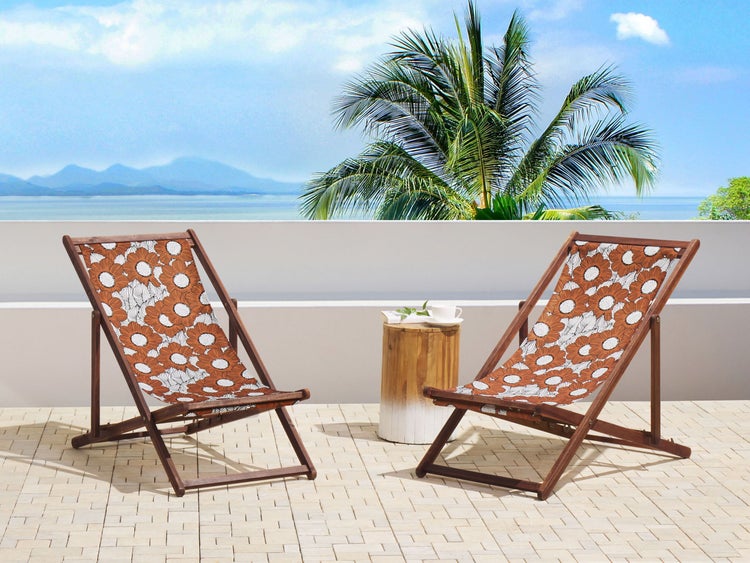 Set mit 2 klappbaren Liegestühlen ANZIO mit Ersatzstoffen Blumenmuster Akazienholz Dunkelbraun