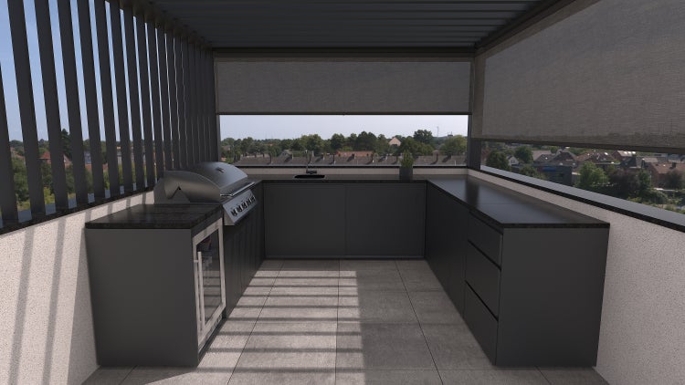 Das Set Napoli im Anthrazit-Dekor mit einer Arbeitsplatte aus Granit besteht aus einem Element mit Spüle, Eckelementen, einem Element mit Türen, einem Element mit Schubladen, einem Element mit einem Outdoor-Kühlschrank und einem Element mit eingebautem Grill.