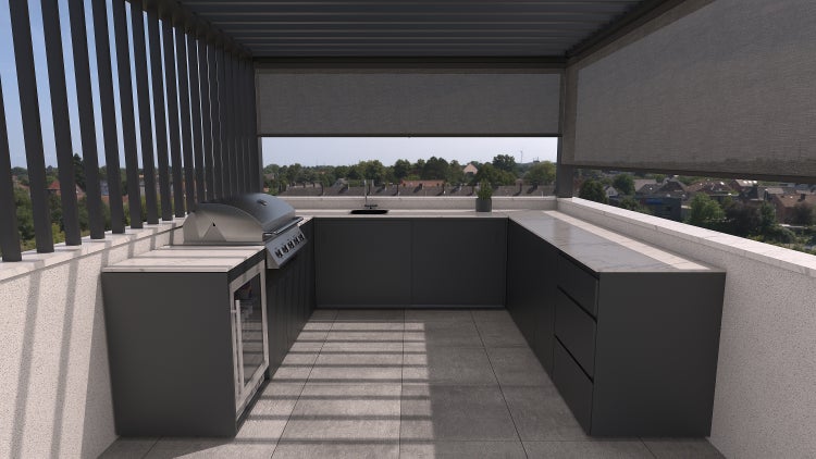 Das Set Napoli im Anthrazit-Dekor mit einer Arbeitsplatte aus Porzellan besteht aus einem Element mit Spüle, Eckelementen, einem Element mit Türen, einem Element mit Schubladen, einem Element mit einem Outdoor-Kühlschrank und einem Element mit eingebautem Grill.