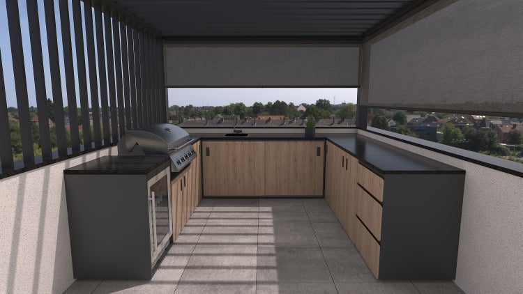 Set Napoli - Eiche - Granit - Pulverbeschichtete U-förmige Edelstahl-Outdoorküche mit Spüle, eingebautem Gasgrill, Außenkühlschrank und Arbeitsplatte aus Granit