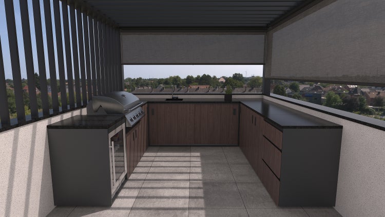 Das Set Napoli im Dekor Amerikanische Walnuss mit einer Arbeitsplatte aus Granit besteht aus einem Element mit Spüle, Eckelementen, einem Element mit Türen, einem Element mit Schubladen, einem Element mit einem Outdoor-Kühlschrank und einem Element mit eingebautem Grill.