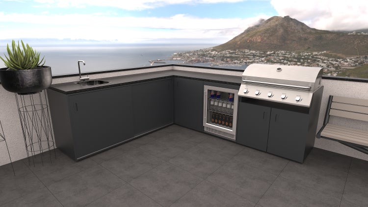Das Set Pisa im Anthrazit-Dekor mit einer Arbeitsplatte aus Granit besteht aus einem Element mit Spüle, einem Eckelement, einem Element mit eingebautem Grill und einem Element mit einem Outdoor-Kühlschrank.