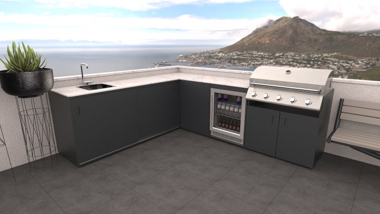 Das Set Pisa im Anthrazit-Dekor mit einer Arbeitsplatte aus Porzellan besteht aus einem Element mit Spüle, einem Eckelement, einem Element mit eingebautem Grill und einem Element mit einem Outdoor-Kühlschrank.
