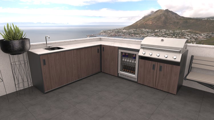 Das Set Pisa im Dekor Amerikanische Walnuss mit einer Arbeitsplatte aus Porzellan besteht aus einem Element mit Spüle, einem Eckelement, einem Element mit eingebautem Grill und einem Element mit einem Outdoor-Kühlschrank.