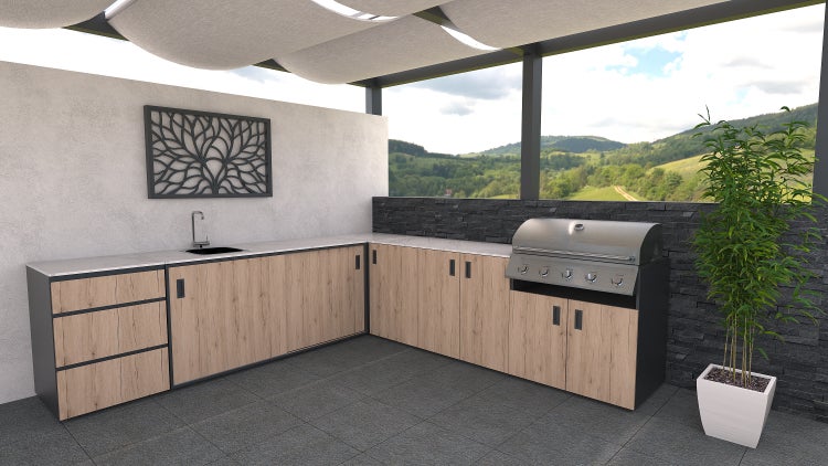 Set Roma - Eiche - Porzellan - Pulverbeschichtete L-förmige Edelstahl-Outdoorküche mit Spüle, eingebautem Gasgrill und Arbeitsplatte aus Porzellan