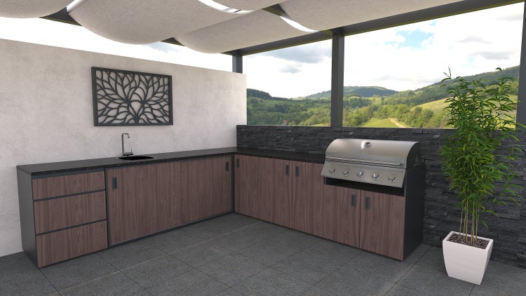 Set Roma - Nussbaum - Granit - Pulverbeschichtete L-förmige Edelstahl-Outdoorküche mit Spüle, eingebautem Gasgrill und Arbeitsplatte aus Granit