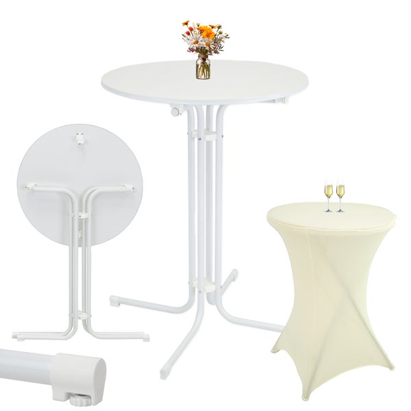 Set Stehtisch klappbar Ø 80 cm in Weiß & Husse Beige bügelfrei Gastrotisch Bistrotisch Partytisch