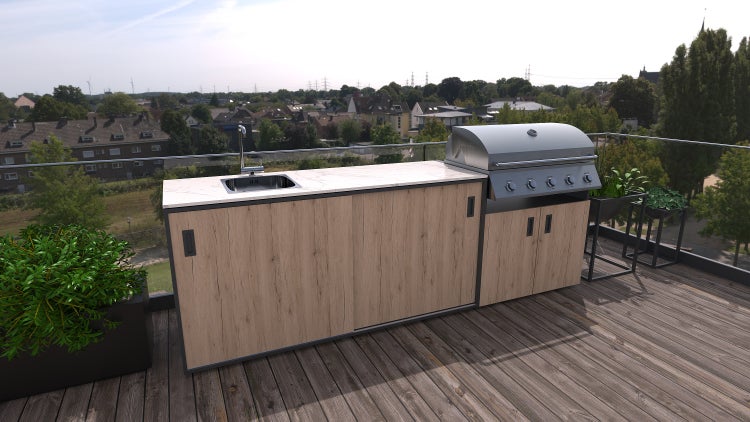 Set Venice - Eiche - Porzellan - Pulverbeschichtete Edelstahl-Outdoorküche mit Spüle, eingebautem Gasgrill und Arbeitsplatte aus Porzellan