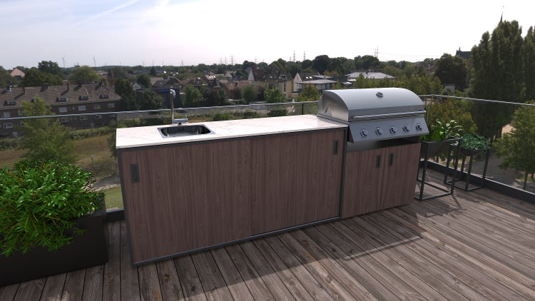 Set Venice - Nussbaum - Porzellan - Pulverbeschichtete Edelstahl-Outdoorküche mit Spüle, eingebautem Gasgrill und Arbeitsplatte aus Porzellan