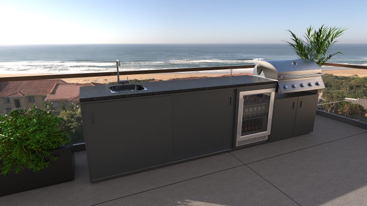 Das Set Verona im Anthrazit-Dekor mit einer Arbeitsplatte aus Granit besteht aus einem Element mit Spüle, einem Element mit eingebautem Grill und einem Element mit einem Outdoor-Kühlschrank.