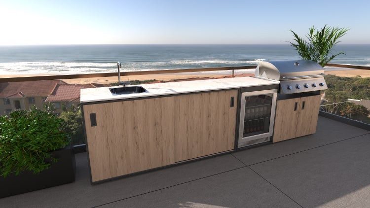 Das Set Verona im Dekor Rustikale Eiche mit einer Arbeitsplatte aus Porzellan besteht aus einem Element mit Spüle, einem Element mit eingebautem Grill und einem Element mit einem Outdoor-Kühlschrank.