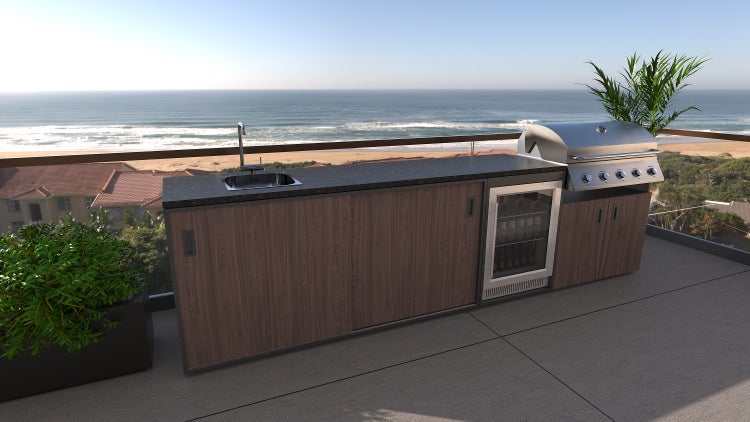 Das Set Verona im Dekor Amerikanische Walnuss mit einer Arbeitsplatte aus Granit besteht aus einem Element mit Spüle, einem Element mit eingebautem Grill und einem Element mit einem Outdoor-Kühlschrank.