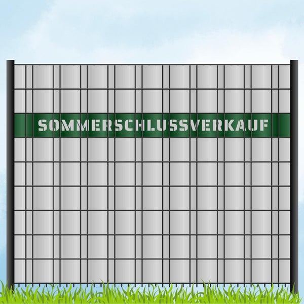Der Schriftzug SOMMERSCHLUSSVERKAUF ist direkt aus dem Material herausgelasert, was eine wetterbeständige und langlebige Alternative zu herkömmlich bedruckten Sichtschutzstreifen darstellt. Mit verschiedenen Farben zur Auswahl kannst du deinem Zaun ein individuelles und attraktives Aussehen verleihen.